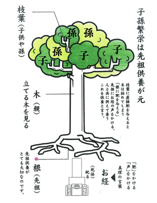 見えている枝葉の部分に直接肥を与えると木は枯れてしまいますが、根(先祖)に肥(声=お経)を与えればおいしい果実が実ります。先祖を正しく供養する事で、子孫繁栄へとつながってゆくのです。