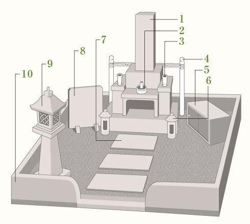 | 1 | 石碑 | 文字を刻むお墓の本体です。この中に納骨所が設けられています。 |